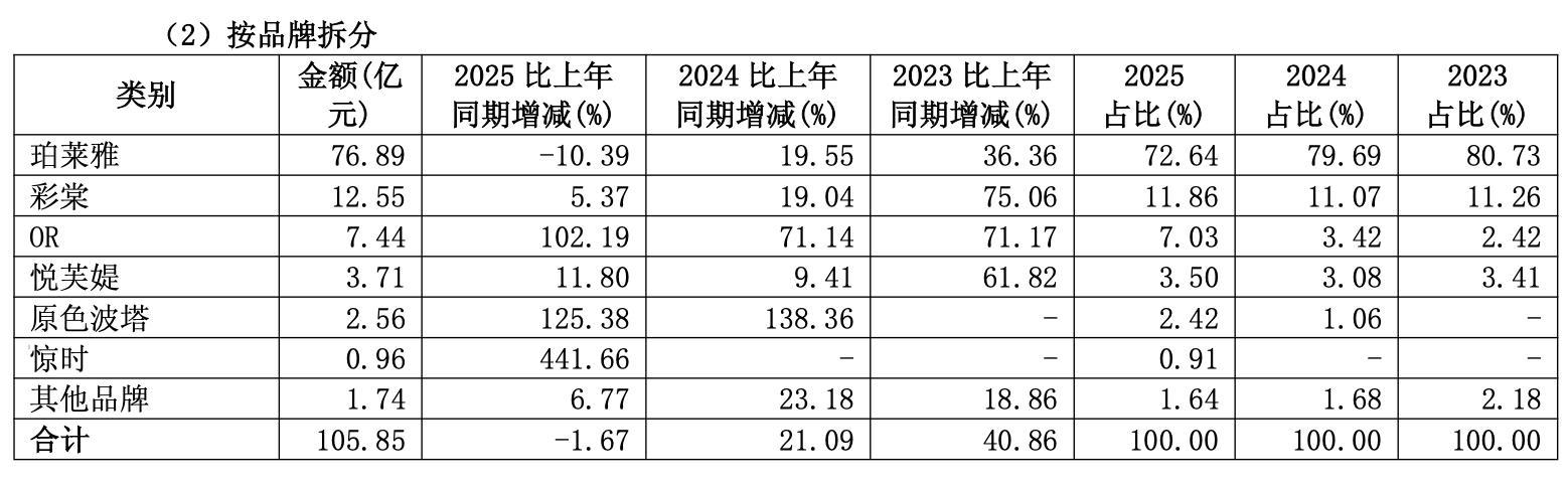 其中,定位中式美学彩妆的彩棠品牌2025年贡献营收12.55亿元,同比增长5.37%,2021年-2024年,该品牌营收增速高达103.48%、132.04%、75.06%和19.04%。