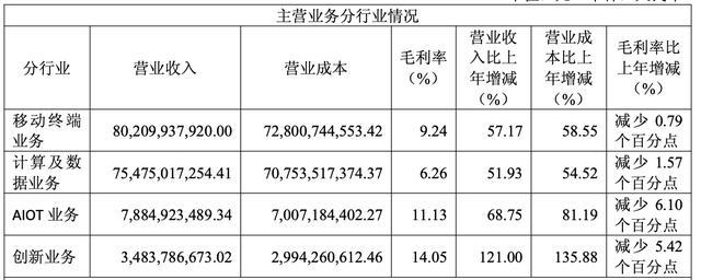 分业务来看,去年全年移动终端营收802亿元,计算及数据中心755亿元,两者合计贡献超1500亿元,仍是基本盘;而AIoT业务营收同比增长68.8%至78.9亿元,创新业务(含汽车电子、机器人等)同比121%至34.8亿元。